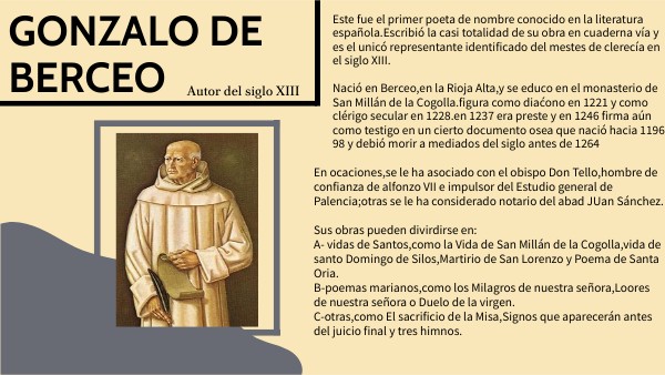Este fue el primer poeta de nombre conocido en la literatura española.Escribió la casi totalidad de su obra en cuaderna vía y es el unicó representante identificado del mestes de clerecía en el siglo XIII. Nació en Berceo,en la Rioja Alta,y se educo en el monasterio de San Millán de la Cogolla.figura como diaćono en 1221 y como clérigo secular en 1228.en 1237 era preste y en 1246 firma aún como testigo en un cierto documento osea que nació hacia 1196-98 y debió morir a mediados del siglo antes de 1264