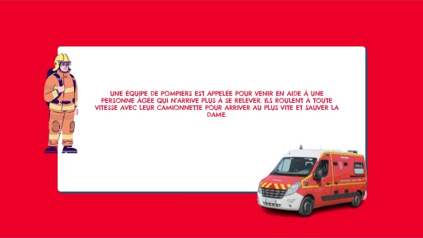 Une équipe de pompiers est appelée pour venir en aide à une personne âgée qui n’arrive plus à se relever. Ils roulent à toute vitesse avec leur camionnette pour arriver au plus vite et sauver la dame.
