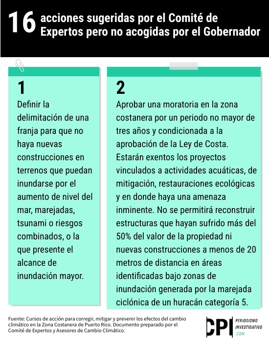 Aprobar una moratoria en la zona costanera por un periodo no mayor de tres años y condicionada a la aprobación de la Ley de Costa. Estarán exentos los proyectos vinculados a actividades acuáticas, de mitigación, restauraciones ecológicas y en donde haya una amenaza inminente. No se permitirá reconstruir estructuras que hayan sufrido más del 50% del valor de la propiedad ni nuevas construcciones a menos de 20 metros de distancia en áreas identificadas bajo zonas de inundación generada por la marejada ciclónica de un huracán categoría 5.