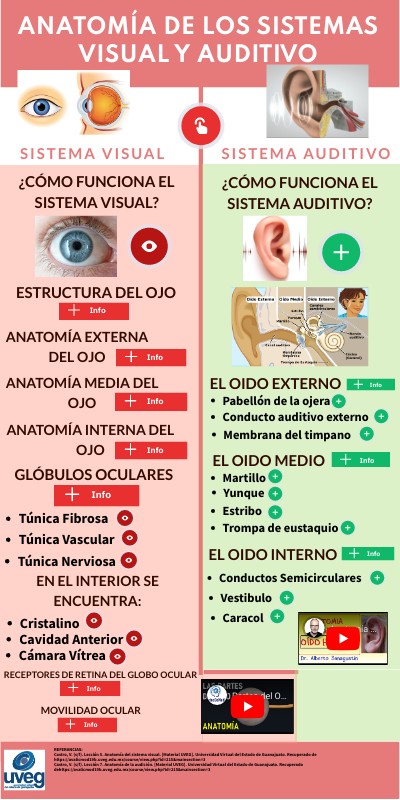 REFERANCIAS: Castro, V. (s/f). Lección 5. Anatomía del sistema visual. [Material UVEG]. Universidad Virtual del Estado de Guanajuato. Recuperado de https://avalicmod19b.uveg.edu.mx/course/view.php?id=215&mainsection=3 Castro, V. (s/f). Lección 7. Anatomía de la audición. [Material UVEG]. Universidad Virtual del Estado de Guanajuato. Recuperado dehttps://avalicmod19b.uveg.edu.mx/course/view.php?id=215&mainsection=3
