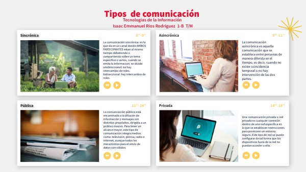La comunicación sincrónica: es la que da en un canal donde AMBOS PARTICIPANTES estan al mismo tiempo debatiendo o compartiendo sobre un tema especifico o varios, cuando se emita la informacion. se divide: unidireccional: no hay intercambio de roles. bidireccional: hay intercambio de roles.