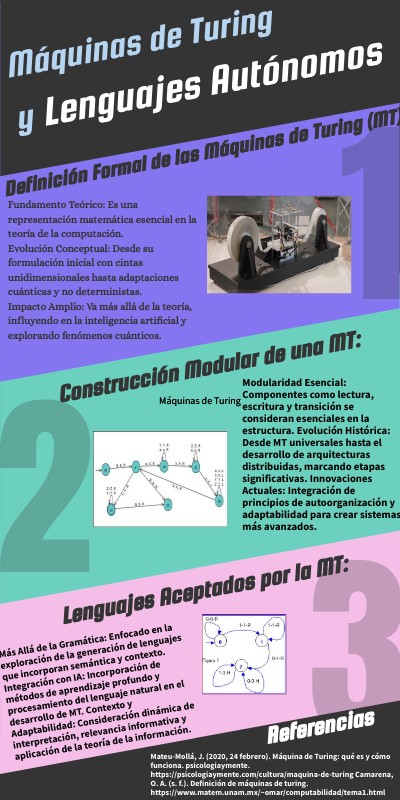 Modularidad Esencial: Componentes como lectura, escritura y transición se consideran esenciales en la estructura. Evolución Histórica: Desde MT universales hasta el desarrollo de arquitecturas distribuidas, marcando etapas significativas. Innovaciones Actuales: Integración de principios de autoorganización y adaptabilidad para crear sistemas más avanzados.