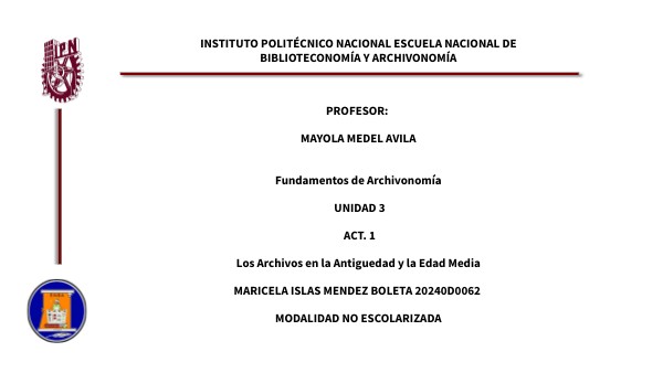 PROFESOR: MAYOLA MEDEL AVILA Fundamentos de Archivonomía UNIDAD 3 ACT. 1 Los Archivos en la Antiguedad y la Edad Media MARICELA ISLAS MENDEZ BOLETA 20240D0062 MODALIDAD NO ESCOLARIZADA