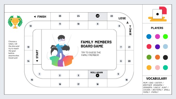 Choose a token, roll the dice and try to reach the goal before anyone else. Good luck!
