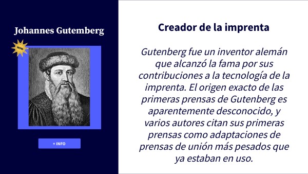 Gutenberg fue un inventor alemán que alcanzó la fama por sus contribuciones a la tecnología de la imprenta. El origen exacto de las primeras prensas de Gutenberg es aparentemente desconocido, y varios autores citan sus primeras prensas como adaptaciones de prensas de unión más pesados que ya estaban en uso.