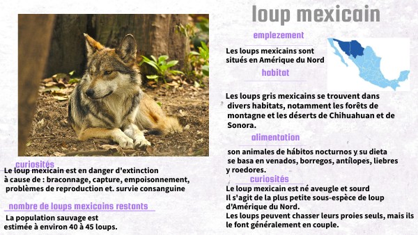 Le loup mexicain est en danger d'extinction à cause de : braconnage, capture, empoisonnement, problèmes de reproduction et. survie consanguine