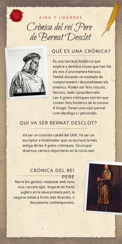 És una narració històrica que explica y destaca coses que han fet els reis d'una manera heroica. També donaven un exemple de comportament i descreditaven els enemics. Poden ser fets viscuts, heroics, reals i providencials.Les 4 grans cròniques són les que conten fets històrics de la corona d'Aragò. Tenen una visió parcial com ideològics i personals.