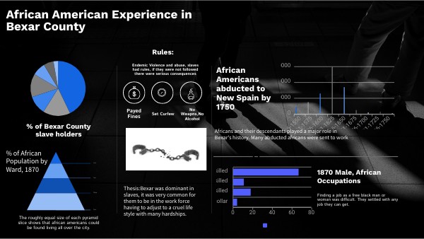 Africans and their descendants played a major role in Bexar's history. Many abducted africans were sent to work