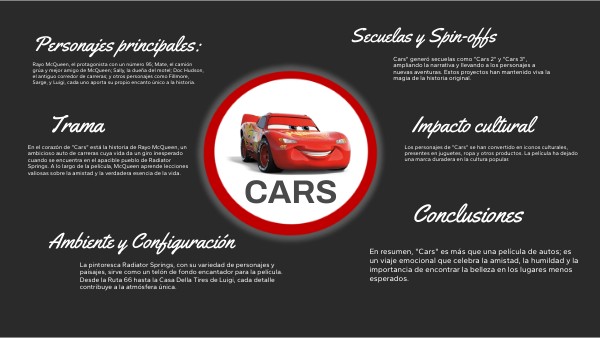 En resumen, "Cars" es más que una película de autos; es un viaje emocional que celebra la amistad, la humildad y la importancia de encontrar la belleza en los lugares menos esperados.