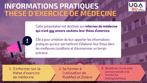 Cette présentation est destinée aux internes de médecine qui n'ont pas encore soutenu leur thèse d'exercice. Elle a pour ambition de leur apporter les informations pratiques qui leur permettront d'élaborer leur thèse dans les meilleures conditions et d'économiser un temps précieux.