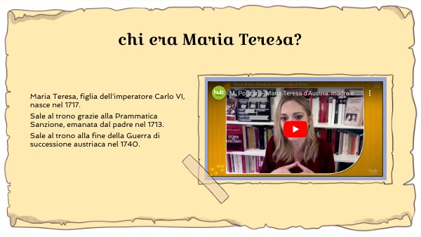 Maria Teresa, figlia dell'imperatore Carlo VI, nasce nel 1717. Sale al trono grazie alla Prammatica Sanzione, emanata dal padre nel 1713. Sale al trono alla fine della Guerra di successione austriaca nel 1740.