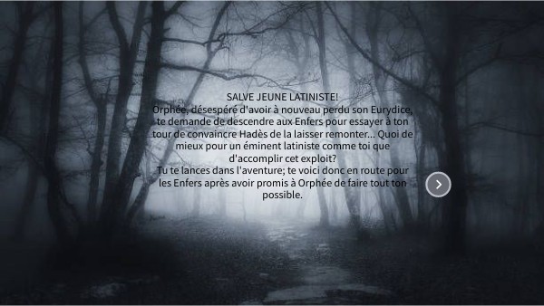 SALVE JEUNE LATINISTE! Orphée, désespéré d'avoir à nouveau perdu son Eurydice, te demande de descendre aux Enfers pour essayer à ton tour de convaincre Hadès de la laisser remonter... Quoi de mieux pour un éminent latiniste comme toi que d'accomplir cet exploit? Tu te lances dans l'aventure; te voici donc en route pour les Enfers après avoir promis à Orphée de faire tout ton possible.