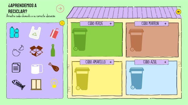 Para profes Haz que tu alumnado aprenda a reciclar los objetos o restos de comida en su cubo correspondiente Para el alumnado Arrastra y suelta cada objeto o resto de comida en su cubo correspondiente Pista: A cada cubo le corresponden 5elementos.