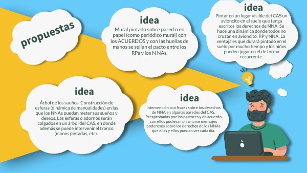 Pintar en un lugar visible del CAS un avioncito en el suelo que tenga escritos los derechos de NNA. Se hace una dinámica donde todos no cruzan en avioncito, RP y NNA. La ventaja es que durará pintado en el suelo por mucho tiempo y los niños pueden jugar en él de forma recurrente.