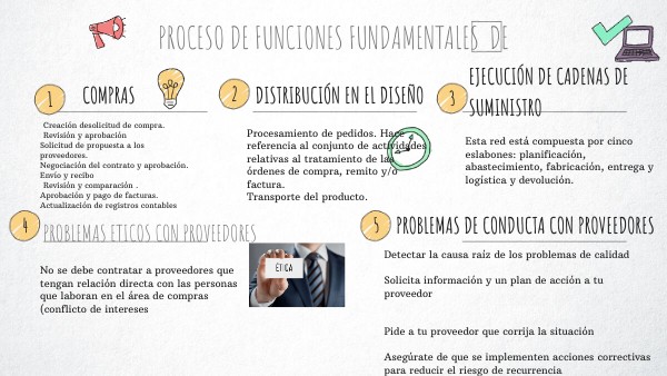 Creación desolicitud de compra. Revisión y aprobación Solicitud de propuesta a los proveedores. Negociación del contrato y aprobación. Envío y recibo Revisión y comparación . Aprobación y pago de facturas.Actualización de registros contables