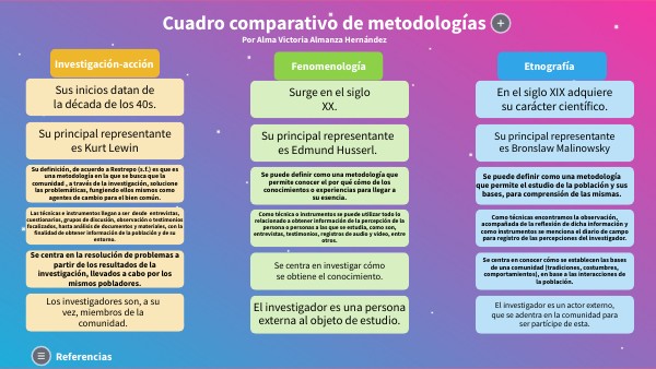 La información del siguiente cuadro se basa en lo aprendido en el foro "¿Qué distingue a una perspectiva metodológica de otra?" de la UVEG y lo mencionado por Pedroza (s.f.a.), Pedroza (s.f.b.), Pedroza (s.f.c.), Colmenares y Piñero (2008), Latorre (2005) y Restrepo (s.f.).