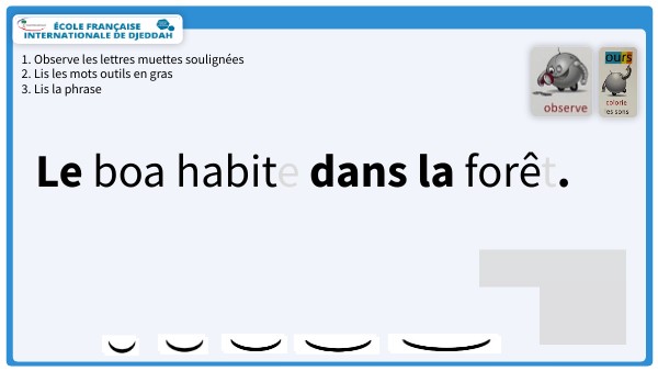 1. Observe les lettres muettes soulignées 2. Lis les mots outils en gras 3. Lis la phrase