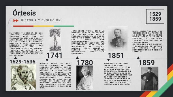 Órtesis y prótesis Monografía Auditoria medica 2017. By Karina Galli, Sabrina Pelozo Year: 2017 URL: https://www.auditoriamedicahoy.com.ar/biblioteca/Karina%20Galli%20Sabrina%20Peloso%20Ortesis%20y%20pr%C3%B3tesis.pdf Historia de las prótesis y órtesis.By admin Container: Proviem Clínica de Movilidad - Prótesis de Pierna y Brazo Publisher: Proviem Clínica de Movilidad Year: 2021 URL: https://proviem.com.mx/historia-de-las-protesis-y-ortesis/ Antecedentes de las ortesis y las prótesis. - Prótesis Pies y Manos.By redaccion Container: Prótesis Pies y Manos Publisher: Prótesis Pies y Manos Year: 2021 URL: https://www.protesispiesymanos.com/antecedentes-en-las-ortesis-y-las-protesis/ ORTESIS Y PROTESIS Conceptos-Historia-Materiales.By URL: https://comisiondefilmaciones.jujuy.gob.ar/wp-content/uploads/jet-engine-forms/11/2023/06/1-Historia-y-Conceptos-12.pdf Línea de tiempo Ortesis y Protesis., 1529 - Procedimientos de amputación,By Container: Coggle.it Publisher: Coggle Year: 2013 URL: https://coggle.it/diagram/X3IhyPnQHKHTlRof/t/l%C3%ADnea-de-tiempo-ortesis-y-protesis