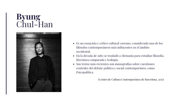 - Es un ensayista y crítico cultural coreano, considerado uno de los filósofos contemporáneos más influyentes en el ámbito occidental.
