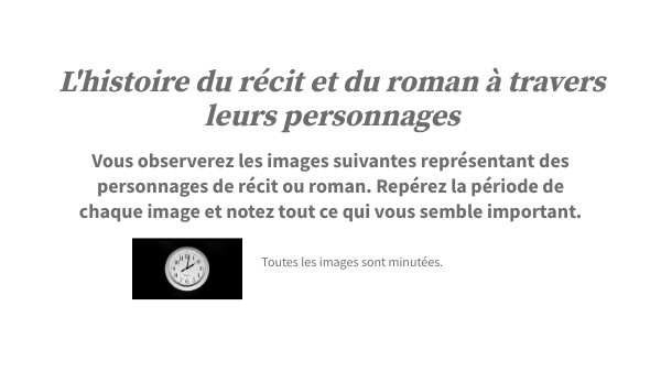 Vous observerez les images suivantes représentant des personnages de récit ou roman. Repérez la période de chaque image et notez tout ce qui vous semble important.