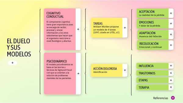 Blanco Ángulo, O. M. (2019). Duelo y depresión en adultos desde el enfoque psicodinámico. Recuperado el 03 de 12 de 2023, de https://digitk.areandina.edu.co/bitstream/handle/areandina/4376/Proyecto%20de%20investigaci%c3%b3n.pdf?sequence=1&isAllowed=y Herrera Herrera , K., Nobles Escandón, L., & Acuña Bermudez, E. (2011). El duelo y sus modelos. Psicodinámico. Psicología desde el Caribe, 197-218. Recuperado el 03 de 12 de 2023, de https://rcientificas.uninorte.edu.co/index.php/psicologia/article/view/3290/9232 Julián Fabila, L., & Hernández Montaño, A. (2022). Intervención cognitivo-conductual en el duelo complicado: un estudio de caso. línica Contemporánea, 13(2), 1-15. Recuperado el 03 de 12 de 2023, de https://www.revistaclinicacontemporanea.org/archivos/cc2022v13n2a2.pdf UTEL. (s.f.). El Duelo y su modelo Cognitivo Conductual. Recuperado el 28 de 11 de 2023, de https://view.genial.ly/6320be5d98ba2200183a48ce UTEL. (s.f.). El Duelo y su modelo Psicodinámico. Recuperado el 28 de 11 de 2023, de https://view.genial.ly/6320be4e93be28001105da29 UTEL. (s.f.). El Duelo y su modelo Psicodinámico. Recuperado el 28 de 11 de 2023, de https://view.genial.ly/6320be4e93be28001105da29