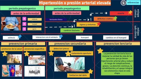 Promoción de la Salud: 1. Educación sobre hábitos saludables: - Fomentar la conciencia sobre la importancia de una dieta balanceada, baja en sodio y rica en frutas y verduras. - Promover la actividad física regular y la importancia de mantener un peso saludable. 2. Concientización sobre el estrés: - Proporcionar información sobre técnicas de manejo del estrés, como la meditación y la práctica regular de actividades relajantes. 3. Campañas de salud comunitaria: - Organizar programas de salud en la comunidad para promover la prevención de la hipertensión. - Proporcionar acceso a chequeos de presión arterial regulares. 4. Promoción de ambientes saludables: - Abogar por entornos que faciliten la actividad física, como áreas para caminar y parques. - Fomentar opciones de alimentos saludables en entornos comunitarios.