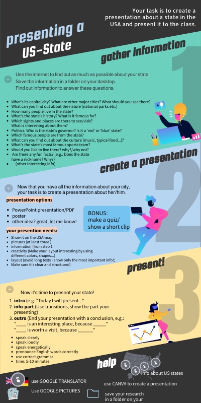 Your task is to create a presentation about a state in the USA and present it to the class.