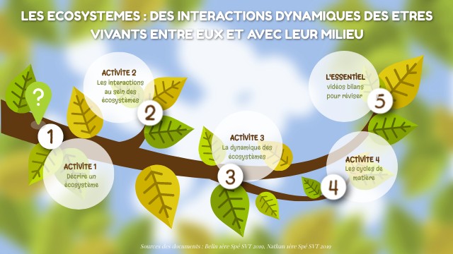 A partir des informations recueillies dans la réalisation des activités suivantes, réaliser une carte mentale ou un sketchnote montrant qu'un écosystème repose sur des interactions dynamiques des êtres vivants entre-eux et avec leur milieu.