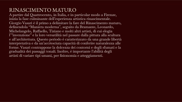 A partire dal Quattrocento, in Italia, e in particolar modo a Firenze, inizia la fase culminante dell’esperienza artistica rinascimentale. Giorgio Vasari è il primo a delimitare la fare del Rinascimento maturo, definendola “Maniera moderna”, seguito da Bramante, Leonardo, Michelangelo, Raffaello, Tiziano e molti altri artisti, di cui elogia l’”invenzione” e la loro versatilità nel passare dalla pittura alla scultura e all’architettura. Questo periodo è caratterizzato da una grande libertà interpretativa e da un’accresciuta capacità di conferire naturalezza alle forme. Vasari contrappone la dolcezza dei contorni e degli sfumati e la gradualità dei passaggi tonali. Inoltre, è importante l’abilità degli artisti di variare tipi umani, per fisionomia e atteggiamenti.