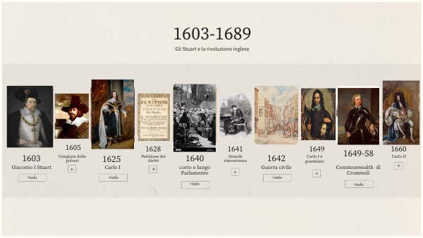 Nel 1603 Elisabetta, che aveva reso l’Inghilterra una monarchia moderna e potente, muore senza eredi. Le succede Giacomo I Stuart, figlio di sua cugina Maria Stuart, che, avendo la corona di Scozia, unisce per la prima volta Inghilterra, Scozia, Galles e Irlanda. Visti i problemi economici dovuti alla guerra con Filippo II, Giacomo impone una forte tassazione, ma nonostante questo l’economia inglese rimane molto dinamica.