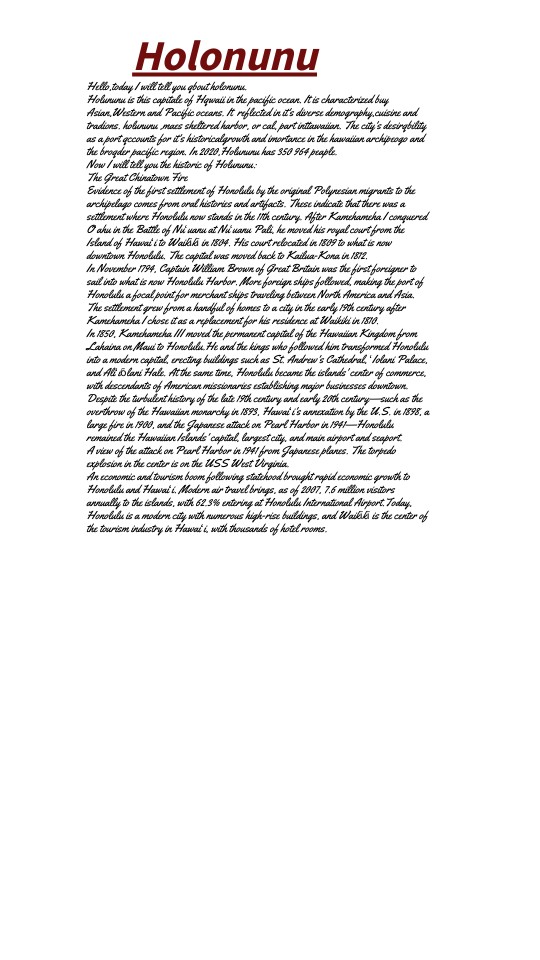 Hello,today I will tell you qbout holonunu. Holununu is this capitale of Hqwaii in the pacific ocean. It is characterized buy Asian,Western and Pacific oceans. It reflected in it's diverse demography,cuisine and tradions. holununu ,maes sheltered harbor, or cal, part inttawaiian. The city's desirqbility as a port qccounts for it's historicalgrowth and imortance in the hawaiian archipeogo and the broqder pacific region. In 2020,Holununu has 350 964 peaple. Now I will tell you the historic of Holununu: The Great Chinatown Fire