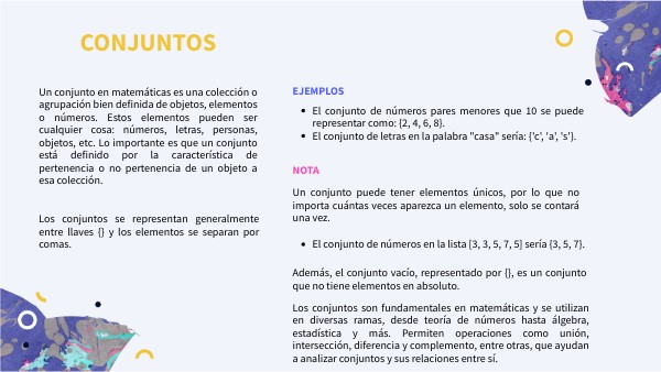Los conjuntos son fundamentales en matemáticas y se utilizan en diversas ramas, desde teoría de números hasta álgebra, estadística y más. Permiten operaciones como unión, intersección, diferencia y complemento, entre otras, que ayudan a analizar conjuntos y sus relaciones entre sí.
