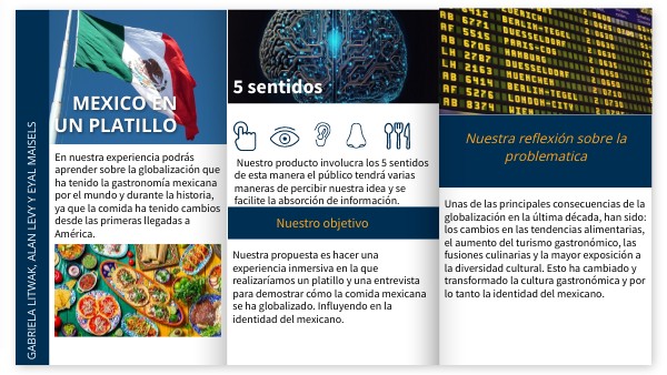Nuestra propuesta es hacer una experiencia inmersiva en la que realizaríamos un platillo y una entrevista para demostrar cómo la comida mexicana se ha globalizado. Influyendo en la identidad del mexicano.