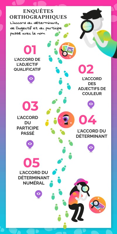 Le déterminant est un mot ou un groupe de mots qui précède le nom. Il s'accorde avec le nom qu'il précède Attention; quelques déterminants sont toujours au pluriel (plusieurs) et d'autre sont toujours au singulier (aucun, chaque...) Vérifiez que le nom qu'il déterminent est bien accordé de la même façon. Attention au déterminant "quel": cherchez le nom qu'il accompagne pour l'accorder correctement (Quelle histoire ! Quels vieux cahiers veux-tu ?) Attention au déterminant "tout": au pluriel, il s'acrit "tous". Il ne faut cependant pas confondre "tous" déterminant et "tous" pronom. Quand il est pronom, on entend le son [S] à la fin. Exemples: J'ai mangé tous les bonbons (déterminant). Je les ai tous mangé. (pronom)