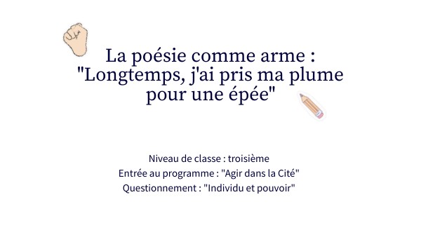 Objectifs : - Identifier ce qui est dénoncé dans un poème engagé et les procédés littéraires mis au service de cette dénonciation - Livrer une lecture personnelle d'un poème engagé Compétences travaillées : - Élaborer une interprétation de textes littéraires - Participer de façon constructive à des échanges oraux Durée : 1h10Activité 1 : Clarifier le sens du poème Activité 2 : S'interroger sur les choix esthétiques du poète Activité 3 : Se mettre dans la peau d'un réalisateur pour livrer sa lecture du poème