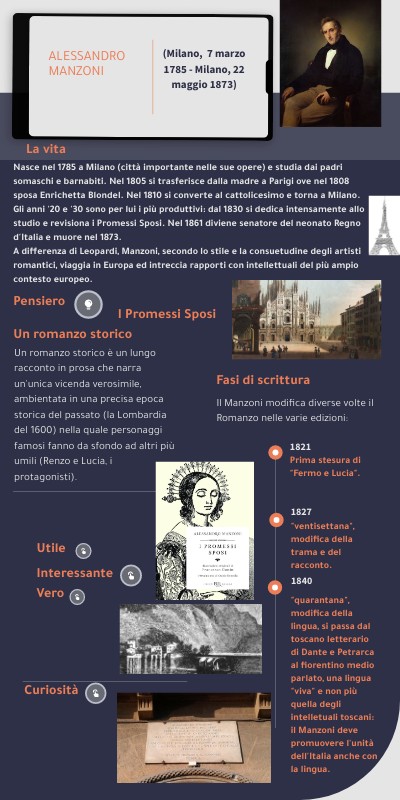 Nasce nel 1785 a Milano (città importante nelle sue opere) e studia dai padri somaschi e barnabiti. Nel 1805 si trasferisce dalla madre a Parigi ove nel 1808 sposa Enrichetta Blondel. Nel 1810 si converte al cattolicesimo e torna a Milano. Gli anni '20 e '30 sono per lui i più produttivi: dal 1830 si dedica intensamente allo studio e revisiona i Promessi Sposi. Nel 1861 diviene senatore del neonato Regno d'Italia e muore nel 1873.A differenza di Leopardi, Manzoni, secondo lo stile e la consuetudine degli artisti romantici, viaggia in Europa ed intreccia rapporti con intellettuali del più ampio contesto europeo.