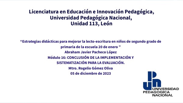 “Estrategias didácticas para mejorar la lecto-escritura en niños de segundo grado de primaria de la escuela 20 de enero ” Abraham Javier Pacheco López Módulo 16: CONCLUSIÓN DE LA IMPLEMENTACIÓN Y SISTEMATIZACIÓN PARA LA EVALUACIÓN. Mtro. Rogelio Gómez Oliva 05 de diciembre de 2023