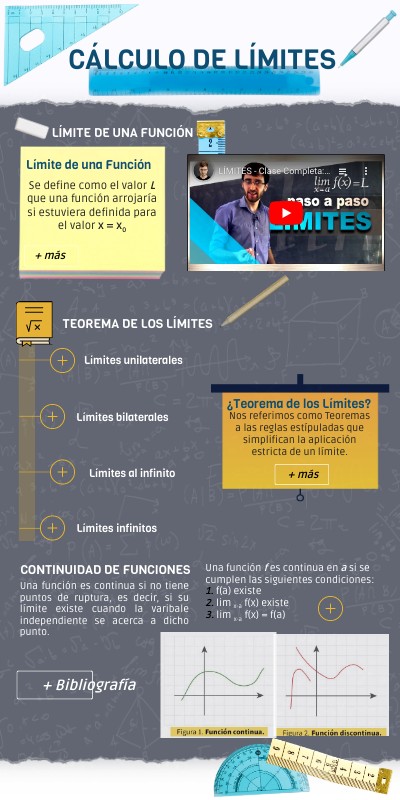 LOS TEOREMAS PARA DETERMINAR EL LÍMITE DE UNA FUNCIÓN._____Límites Unilaterales.Para ser más exactos, los Límites Unilaterales los restringimos para cuando x se aproxime desde un solo lado.Se pueden generalizar por dos puntos importantes: * x se aproxima por derecha: x -> a+ * x se aproxima por izquierda: x -> a-_____Límites Bilaterales:Los límites bilaterales de una función existen si los límites unilaterales por la derecha e izquierda son iguales. * En ejemplo, si se tiene una unción f(x), el límite bilateral en un punto a se denota como lim(x -> a) f(x) y existe si y solo si lim(x -> a-) f(x) = lim(x -> a+) f(x) = L, donde L es un número real._____ Límites al Infinito:Los límites al infinito describen el comportamiento de los valores de una función cuando se hacen muy grandes. * El símbolo "infinito" no representa un número real, en cambio describe el comportamiento de la función f(x), que se hace más y más grande; igualmente con el símbolo "- infinito", que se hace más y más negativa. * La función lim x -> "infinito" f(x) = L, no es un valor de la función, sino, una abreviatura, la cual muestra lo que la función está haciendo cuando crece en valores muy grandes. * Las tres maneras de calcular los Límites al Infinito son: por representación gráfica, por sustitución y, por deducción._____Límites Infinitos: Ocurren cuando el valor de una función se hace infinitamente grande (positivo o negativo) a medida que la variable independiente se acerca a un valor específico. * En ejemplo, la función f(x) = 1/(x-2), a medida que x se acerca a 2, el valor de la función se hace infinitamente grande. * Al igual que los Límites al Infinito, las maneras de calcular los Límites Infinitos son: por representación gráfica, por sustitución y por deducción.