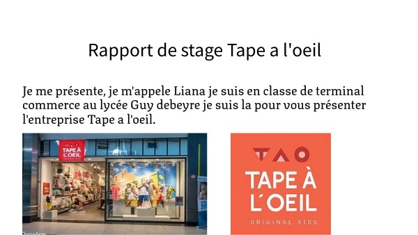 Je me présente, je m'appele Liana je suis en classe de terminal commerce au lycée Guy debeyre je suis la pour vous présenter l'entreprise Tape a l'oeil.