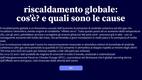 Il riscaldamento globale è un fenomeno causato dall’aumento di emissioni di anidride carbonica ed altri gas che riscaldano l’atmosfera, dando origine al cosiddetto “effetto serra”. Tutto questo porta ad un aumento delle temperature che, con gli anni, potrebbero arrivare a sciogliere gli enormi ghiacciai del polo nord - processo già in atto - con un conseguente aumento del livello del mare, che porterebbe a gravi inondazioni in molti paesi e la scomparsa di molte isole.