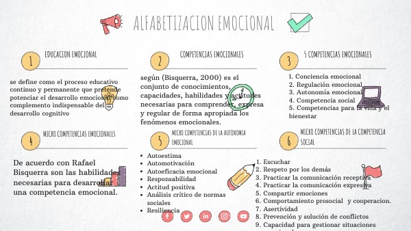 1. Conciencia emocional 2. Regulación emocional 3. Autonomía emocional 4. Competencia social 5. Competencias para la vida y el bienestar