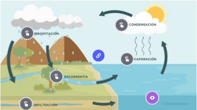 imagen interactiva que resume el ciclo del agua para niños de primaria.