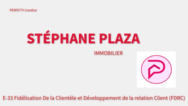 NOM DE L'ENTREPRISE :Stéphane Plaza Immobilier DATE CRÉATION: 2021 FONDATEURS: Stéphane Plaza, Bernard Augier et Patrick Khider (2 Anciens dirigeants de l'enseigne LAFORET) COORDONNÉES: 04 84 89 58 00 ADRESSE: 27 Av.Comtesse Lily Pastré, 13010 Marseille FORME COMMERCIALE ET JURIDIQUE: SAS, société par action simplifier au capital de 20000 euros