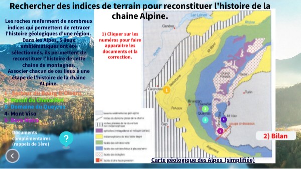 Les roches renferment de nombreux indices qui permettent de retracer l'histoire géologiques d'une région. Dans les Alpes, 5 lieux emblématiques ont été sélectionnés, ils permettent de reconstituer l'histoire de cette chaine de montagnes. Associer chacun de ces lieux à une étape de l'histoire de la chaine ALpine.