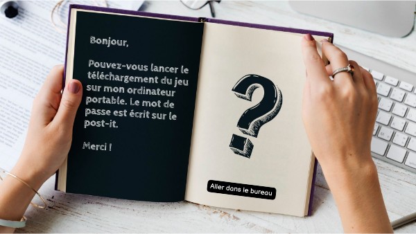 Bonjour, Pouvez-vous lancer le téléchargement du jeu sur mon ordinateur portable. Le mot de passe est écrit sur le post-it. Merci !