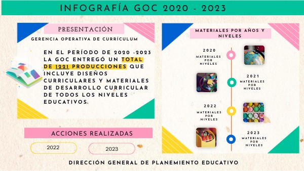 EN EL PERÍODO DE 2020 -2023 LA GOC ENTREGÓ UN TOTAL DE 1221 produccionES QUE Incluye Diseños Curriculares y materiales de desarrollo curricular DE TODOS LOS NIVELES EDUCATIVOS.