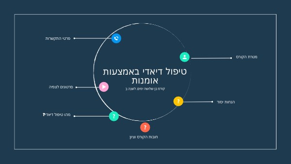 הקורס יתמקד בהקניית ידע בתחום הטיפול הורה-ילד כמו גם בהתנסות חווייתית ובחיבור שביניהם. בנוסף יתקיים דיון המשלב הבנה והעמקה של התחום כמו גם התנסויות מהשטח והצגת מקרה שתועבר על ידי המרצה. בסיום הקורס יבחנו הסטודנטים על ידע והבנה בכל הקשור לנושא הדיאדיא. הקניית ידע בתחום הטיפול הורה- ילד באמצעות אומנות פלסטית ב. פיתוח היכולת להתנסות במפגשים טיפוליים בילד ובמשפחתו בהרכבים דיאדיים שונים , באמצעות אומנות ג. התנסויות חווייתיות בטכניקות של טיפול דיאדי באמצעות אמנות
