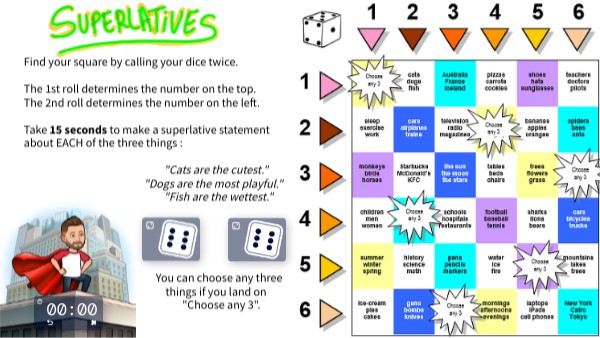 Find your square by calling your dice twice. The 1st roll determines the number on the top. The 2nd roll determines the number on the left. Take 15 seconds to make a superlative statement about EACH of the three things : "Cats are the cutest." "Dogs are the most playful." "Fish are the wettest." You can choose any three things if you land on "Choose any 3".