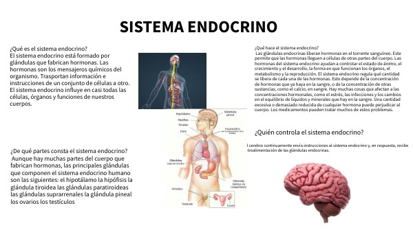 ¿Qué es el sistema endocrino? El sistema endocrino está formado por glándulas que fabrican hormonas. Las hormonas son los mensajeros químicos del organismo. Trasportan información e instrucciones de un conjunto de células a otro. El sistema endocrino influye en casi todas las células, órganos y funciones de nuestros cuerpos.