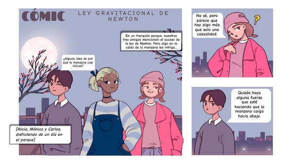En un tranquilo parque, nuestros tres amigos mencionan el suceso de la ley de Newton. Pero algo en la caída de la manzana les intriga...